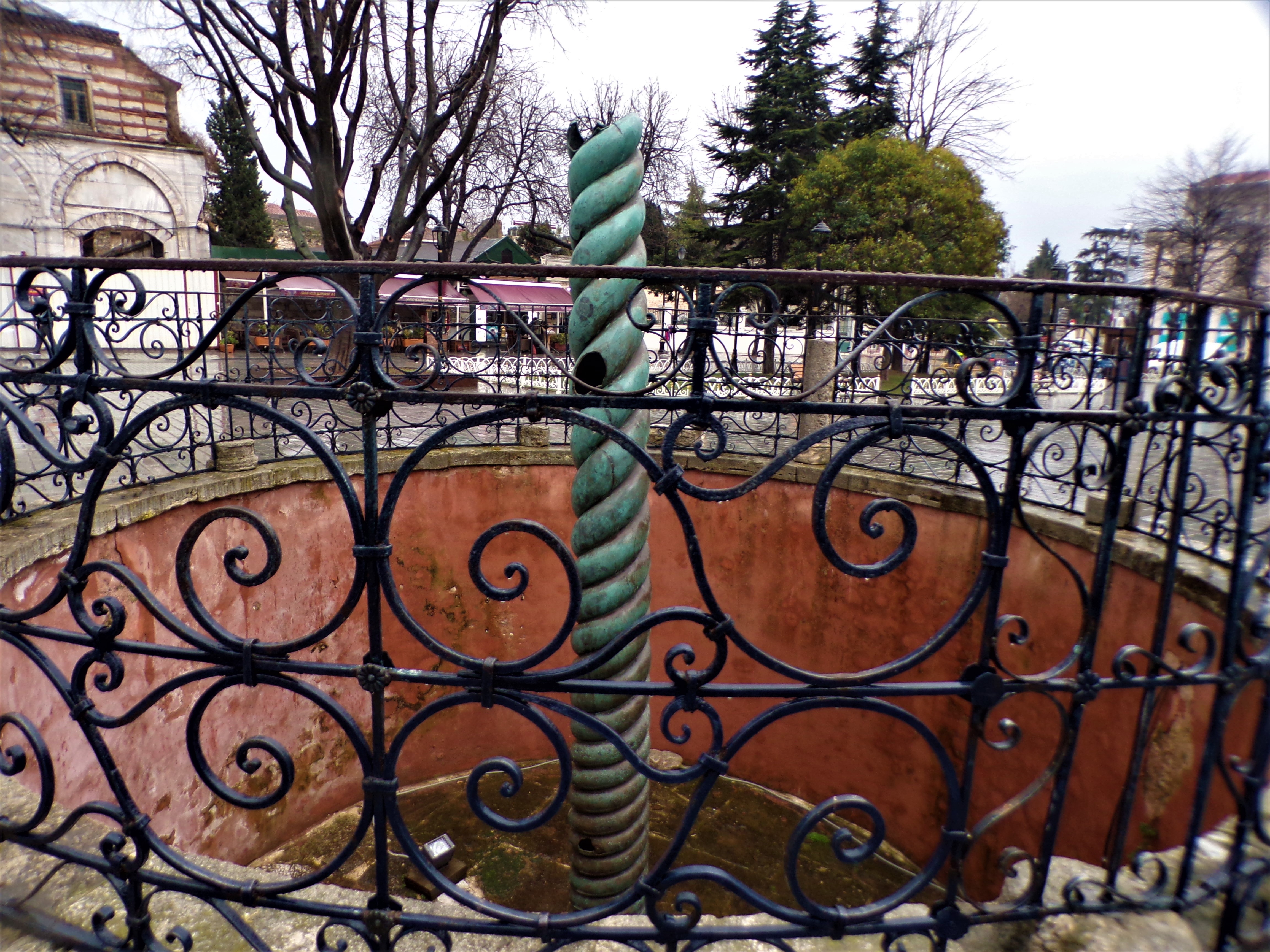 The top of the column once held a golden bowl supported by three intertwined snakes. The heads were said to have been on until about the 17th century. One of the heads can be found in the archaeology museum. The bowl and the other two are missing. One story from the late 17th century is that a drunken Polish nobleman is said to have broken one of them off.