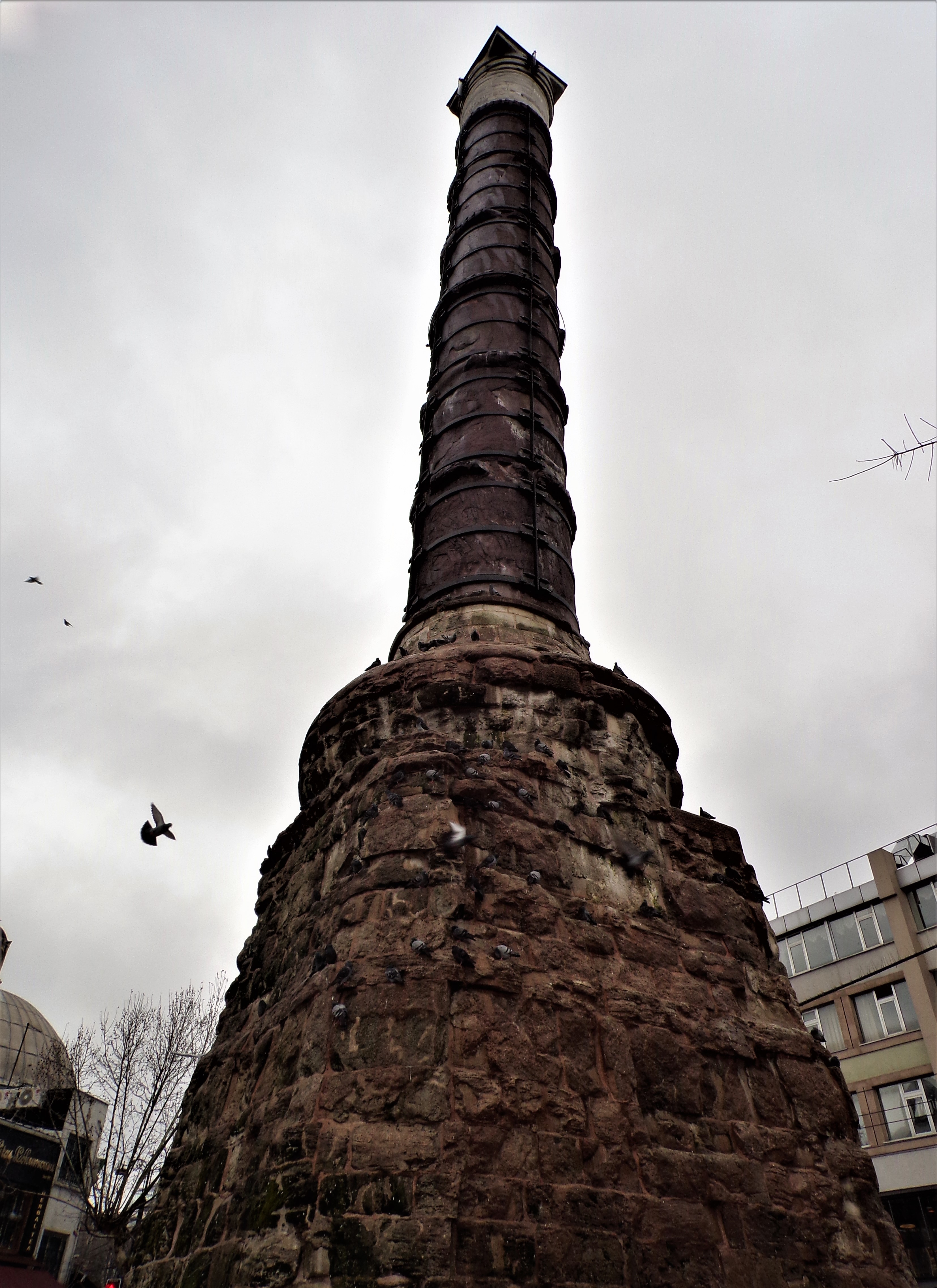 The 32 m (105 ft) high structure once held a sphere at its top and had its sides decorated with bronze plaques that portrayed the conquests of his grandfather, Emperor Basil I. Crusaders in 1204 are said to have stolen and melted down the bronze plaques during the fourth crusade. Further wear and tear occurred to its stone surface after it became a popular place for young Janissaries, elite infantry soldiers of the Ottomans, to show off their skill by climbing to the top.