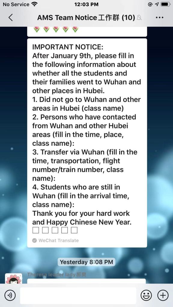 Supposedly, right now, the number of recoveries far exceeds deaths and in Beijing there’s only 200+ cases out of 21 million people. The problem is, though, when everyone comes back to start work on the 10th, and the fact that there are 3,000+ more cases each day. Speculation is we might do class online, but no idea how that would go as many of my colleagues abroad don’t have their textbooks.