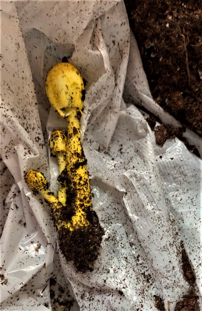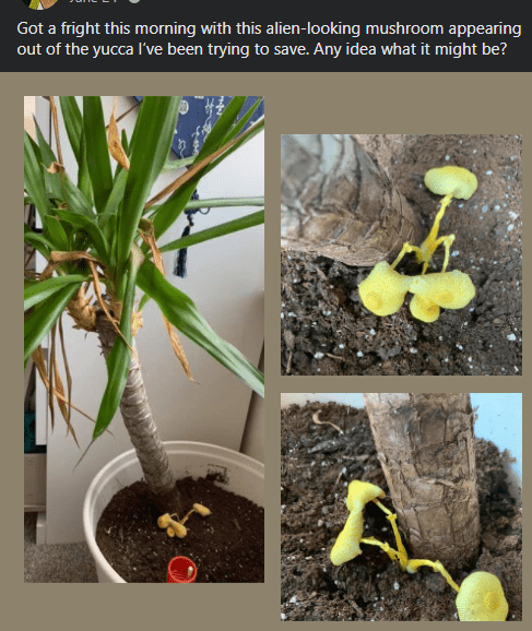 About two months ago, I noticed these strange, alien-looking mushrooms growing out of a Yucca that I was trying to save. They had seemingly appeared overnight, and straightaway gave me the heebie-jeebies! Upon first horrified glance, I hurriedly shared it to the local Maryland Mycology Facebook Group in the hopes that someone could tell me what these weird things were and how worried I should be.