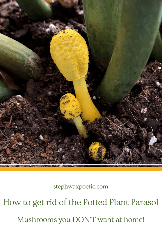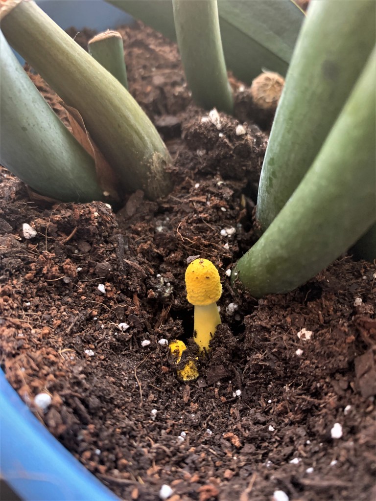 In the process of unpacking and checking on our houseplants, however, I noticed a color amidst the varying shades of green that shouldn’t be there. Poking up out of the earth of one of the pots was a sickly yellowish-white projection that could only mean one thing: the Potted Plant Parasol is back!