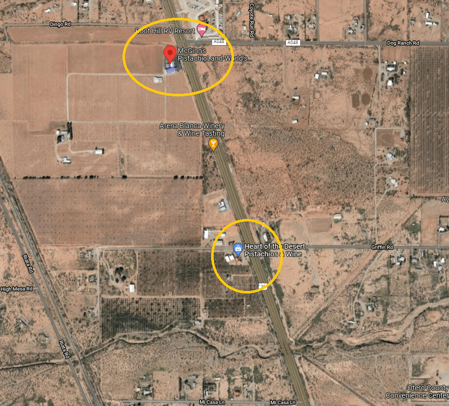 Accordingly, Alamogordo has two competing pistachio farms and vineyards located right next to each other off U.S. Hwy 54/70 North: Heart of the Desert at Eagle Ranch and McGinn’s Pistachio Ranch.