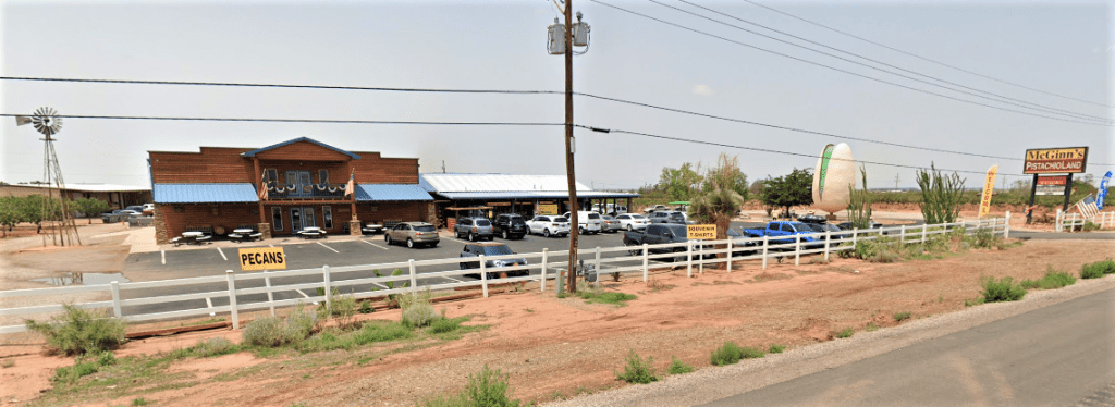 McGinn’s Pistachioland was started by Tom McGinn, a nut salesman and author originally from Panama. He worked previously for the United Fruit Company in the fifties and sixties which sent him around Guatemala, Columbia, and Honduras, and then on to California for various food companies such as Cool Whip.  He saw an opportunity and planted his first pistachios in the Tularosa Basin in 1980, about a decade after Heart of the Desert was established. Since then, they’ve expanded to multiple stores and opened the Arena Blanca Winery. In 2008, Tim McGinn had “The World’s Largest Pistachio,” a 30-foot tall pistachio statue built immediately adjacent to the highway. As McGinn explains, he erected it in memory of his father who was said to have enjoyed old-timey roadside attractions.