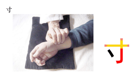 The extra teeny stroke under the left finger emphasizes the Cunkou Point (寸口, Cùnkǒu, pronounced tsoon coh), the place where a TCM practitioner takes a person’s pulse. Since the Cùnkǒu Point is small, this stroke in the character cùn is also small.