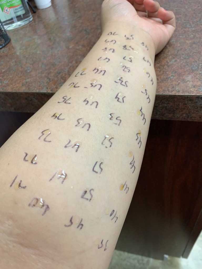 Tired of playing the “oh, I might be allergic to this” and the “so maybe I should be doing this” guessing game, I made the decision to sign up for an official allergy test at a local allergy center (thank you insurance!). I went in for a consultation and was told to return after not taking any allergy pills for seven days. I had taken a sleeping pill four days before, otherwise I’d have been able to do it then. This is because sleeping pills have diphenhydramine (Benadryl), a sedating antihistamine.