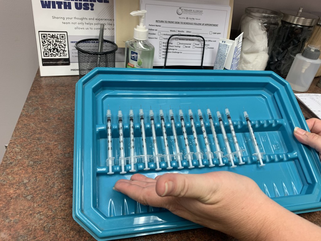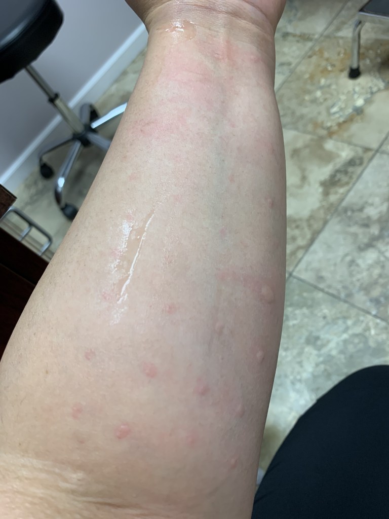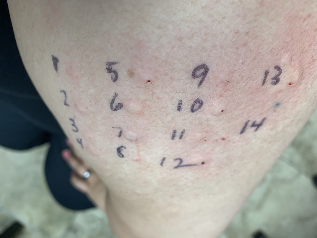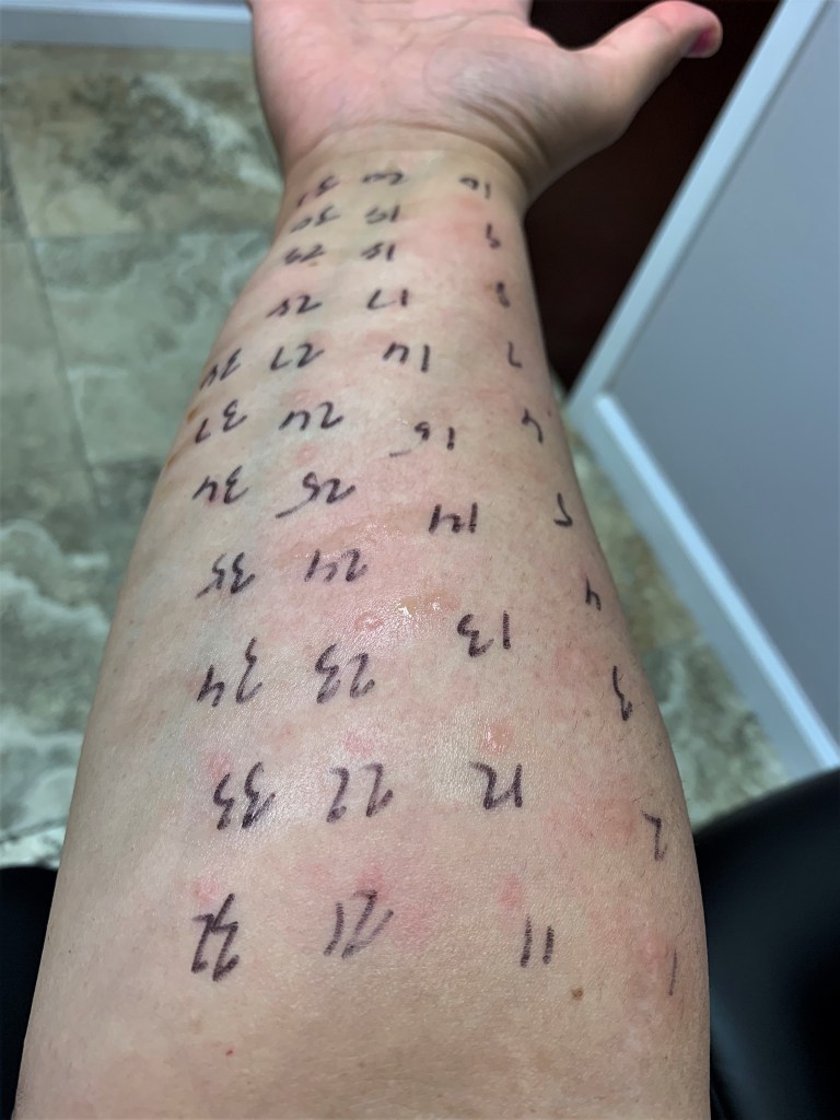 The seven days were up and I returned anxious and oddly excited! I found how systematic it was fascinating. The assistant wrote numbers on my forearms (she did offer to do it on my back instead, but I wanted to see the results). I was to be given 74 scratches (not shots) by what looked like sharp plastic tube things that were soaking in solutions of various allergens. Each scratch was numbered according to its corresponding solution testing common things such as plants, dog hair, and even cockroach!